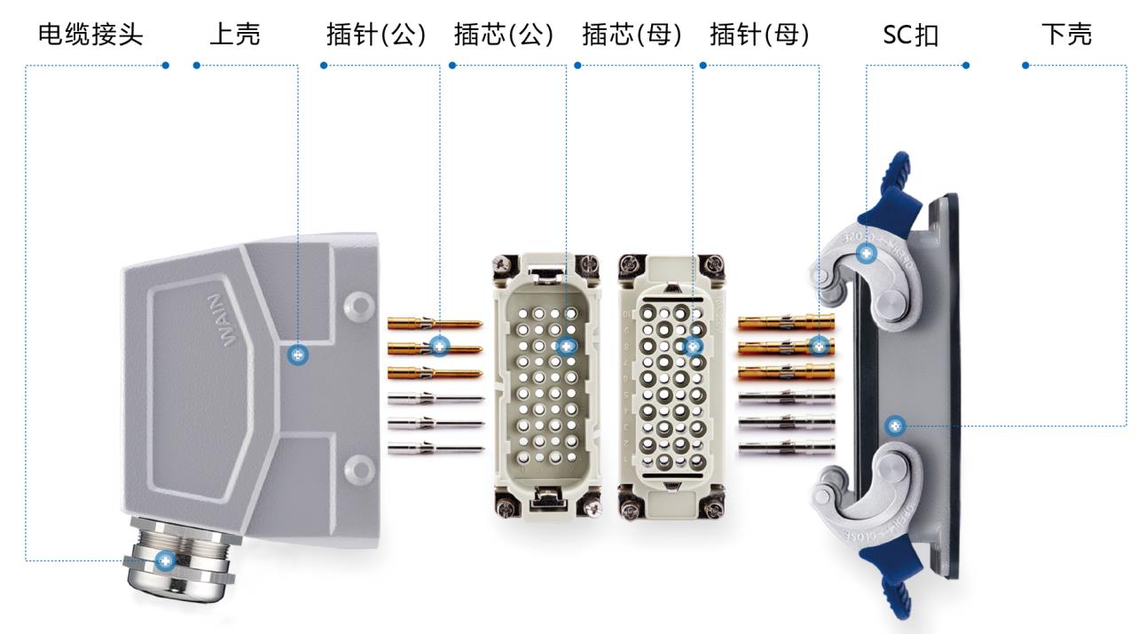 插芯:絕緣件、保護固定插針 插針:接觸件 電纜接頭:固定電纜