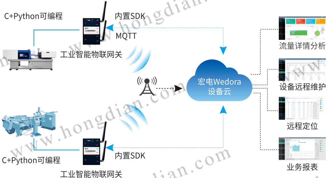 對于數(shù)控機床的生產(chǎn)廠商來說,他們需要掌握已售出的數(shù)控機床開工狀態(tài)和地域分布,以便精準的制定未來生產(chǎn)計劃和銷售策略;同時需要了解每臺設備的運行狀態(tài)和性能指標,進行預測性的維護,為客戶提供更好的服務。對于購買數(shù)控機床的制造企業(yè)來說,不僅需要實時監(jiān)測數(shù)控機床的工作狀態(tài),也需要一種解決方案來實現(xiàn)加工指令的快速發(fā)放,幫助工廠管理者更有效的分配企業(yè)資源,優(yōu)化生產(chǎn)流程,避免數(shù)控機床的空轉、斷線或者停機維護, 深圳市宏電技術股份有限公司其中一個數(shù)控機床客戶就面臨這樣的問題,客戶是一家著名品牌數(shù)控機床在中國的合資公司,也是該品牌在中國大陸的唯一代表,承擔近百萬套數(shù)控機床的售后服務工作,其售后負責人希望能對售出的數(shù)控機床工作狀態(tài)、分布情況實時了解,以便精準的制定未來生產(chǎn)計劃和銷售策略,同時還希望在故障發(fā)生前就提前預測,避免數(shù)控機床的空轉、斷線或者停機維護,給企業(yè)生產(chǎn)運營帶來損失。 經(jīng)過多次與數(shù)控機床廠家的交流,宏電認為首先需要解決設備聯(lián)網(wǎng)的網(wǎng)絡通道和網(wǎng)絡接入的問題,根據(jù)數(shù)控機床設備在全國、全球的點多分散及使用現(xiàn)場的環(huán)境,對數(shù)控機床CNC控制單元和測量數(shù)據(jù)單元的遠程診斷維護及數(shù)據(jù)監(jiān)測,通過無線通信隨時通信、易部署特點,以邊緣計算網(wǎng)關—宏電工業(yè)智能物聯(lián)網(wǎng)關為載體建立機床設備之間互聯(lián)互通的通道,建立數(shù)控機床遠程智能監(jiān)控系統(tǒng),具體方案實施主要從以下幾個方面: