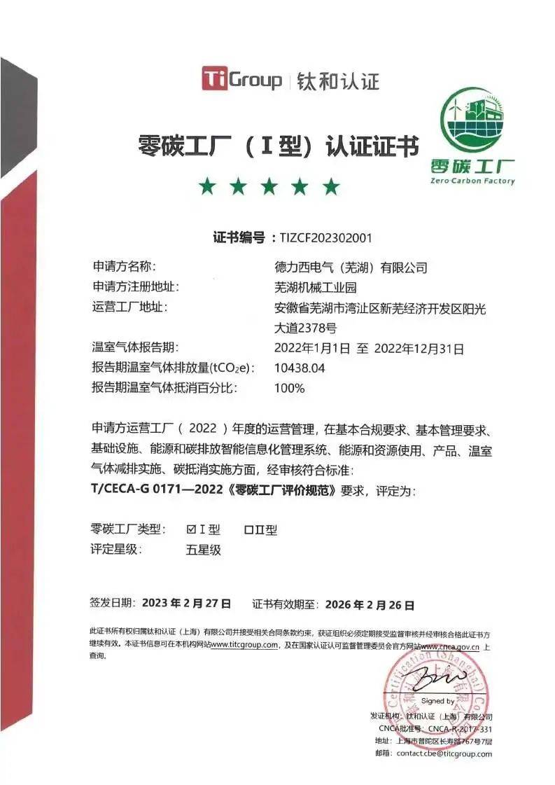 德力西電氣踐行可持續發展戰略,以綠色可持續發展文化為引領,發展綠色能源、循環經濟,大力提升能源效率,同時在碳智能信息化管理系統、資源使用、碳抵消等方面也有卓越表現,經鈦和認證核算,德力西電氣蕪湖基地對直接溫室氣體排放和外購能源帶來間接溫室氣體的100%抵消,共計10438.04噸二氧化碳,達到Ⅰ型五星級零碳工廠等級。