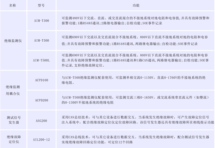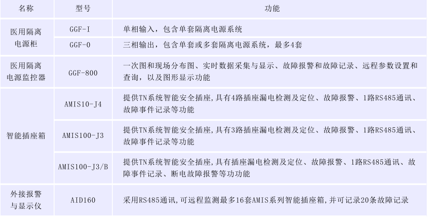 圖形顯示功能 系統(tǒng)可以以曲線的形式,顯示各IT配電系統(tǒng)的絕緣狀況、負(fù)載狀況,以及隔離變壓器的溫升狀況,以及它們的變化趨勢(shì),以便于分管理人員了解和分析各電源系統(tǒng)的運(yùn)行變化情況,有針對(duì)性的對(duì)某些系統(tǒng)進(jìn)行維護(hù)和保養(yǎng)。 設(shè)備選型 醫(yī)療IT配電監(jiān)測(cè)系統(tǒng)產(chǎn)品