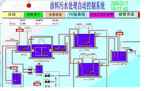 此污水處理系統主要是處理涂料廠的生活污水及工廠污水,經過各種化學工藝處理,最終達到排放標準,整個系統主要包括各種參數調節(分步運行或超濾運行)、UASB厭氧化反應、PH值調節、反滲透、中和、攪拌等工藝,可以按用戶預先設定的程序自動開啟動各個水泵進行加藥及攪拌,自動檢測各個槽的液位及PH值調節,自動抽出污泥沉淀等,使最終的排放水達到國家排放標準。