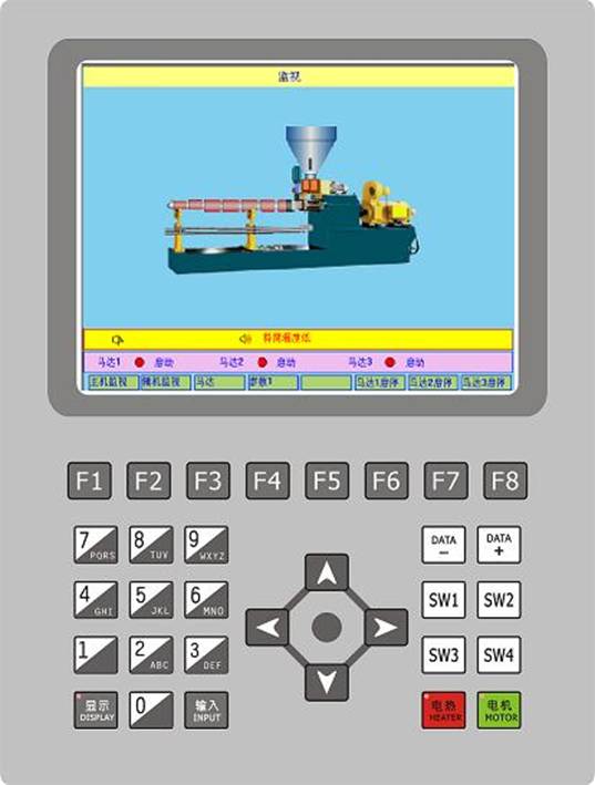 10.4"TFT 液晶顯示器,640×480點陣,中英文顯示; 鍵盤部分用參數輸入、加熱與電機的啟停控制; 采用RS485接口與主機、PC機或其它工業產品(如變頻器、PLC等)通信,實現程序在線燒錄及相關動作控制; 參數曲線記憶功能,繪制10分鐘以內的溫度變化曲線。多組模具參數記憶功能; 15段的溫度采樣及控制,8段吹風控制; 溫度輸入接K型熱電偶,測溫范圍是0~400℃; 三路DA輸出0~10V電壓,控制電機轉速; 二路AD輸入,采樣0~10V電壓信號,用于壓力閉環控制; 繼電器輸出可接交流接觸器; 主機控制采用220V輸入開關電源, 輸出 +24V/1.5A,+12V/1A,–12V/1A; 顯示面板采用220V輸入開關電源, 輸出 +24V/1A; 上下位機均為高性能DSP微處理系統; 溫度主要采用PID控制方式,控制參數可調并存于密碼頁面中; 完善的報警功能:當前工況之溫度,電流,轉速不在預設范圍之內時,系統報警請求認為干預,當擠出機檢測缺料,牽引力不足等情況及系統故障時,也有相應報警輸出; 采用美國,臺灣進口優質元器件,系統故障率低,穩定性好。