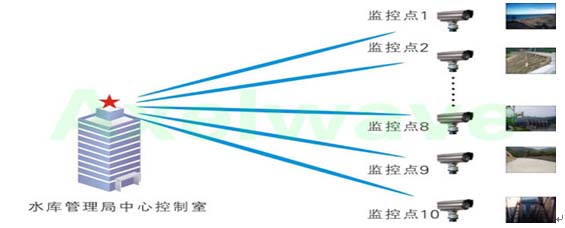 該系統(tǒng)主要由三部分組成,前端視頻、語(yǔ)音、數(shù)據(jù)等采集系統(tǒng),無(wú)線網(wǎng)絡(luò)傳輸系統(tǒng),水庫(kù)管理中心控制系統(tǒng)。前端的多路視頻、數(shù)據(jù)及IP電話等都先通過(guò)交換機(jī)進(jìn)行匯聚,然后進(jìn)入艾克賽爾(Axelwave)的無(wú)線網(wǎng)橋進(jìn)行無(wú)線傳輸,所有前端點(diǎn)都采用太陽(yáng)能供電系統(tǒng)供電,在陰雨條件下可以支持連續(xù)工作72小時(shí)以上。中心水庫(kù)管理控制室與前端組成點(diǎn)對(duì)多點(diǎn)的無(wú)線傳輸鏈路,將前端的所有信息匯總至控制室。控制中心可以實(shí)時(shí)監(jiān)控各前端點(diǎn)的視頻圖像,如水庫(kù)水位情況,閘門、大壩的工作狀態(tài),水面及岸邊情況等等,另外還能觀察到前端發(fā)回各種的實(shí)時(shí)數(shù)據(jù)信息,如水庫(kù)水質(zhì)變化、水庫(kù)天氣變化等,真正做到對(duì)水庫(kù)各重點(diǎn)區(qū)域的全天候、多角度、全方位的實(shí)時(shí)監(jiān)控,做到有效應(yīng)對(duì)各種突發(fā)事件,確保了水庫(kù)各方面的安全運(yùn)行。